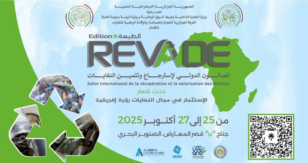 تنطلق من 25 إلى 27 أكتوبر 2025 فعاليات الطبعة التاسعة من المعرض الدولي لاسترجاع وتثمين النفايات (REVADE) بقصر المعارض بالصنوبر البحري في الجزائر العاصمة، تحت شعار “تثمين الموارد في إفريقيا، آفاق تنموية مستدامة”، تحت رعاية وزارتي التجارة الداخلية وضبط السوق الوطنية ووزارة البيئة وجودة الحياة،