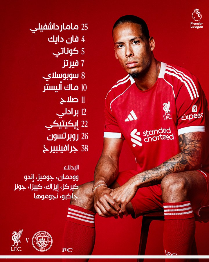 بينما اختار الهولندي آرني سلوت (47 عاما) المدير الفني لفريق ليفربول، التشكيلة الأساسية التالية لخوض هذه المباراة ضد مضيفه مانشستر سيتي:
