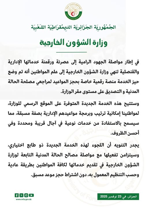 يجدر التنويه أن اللجوء لهذه الخدمة الجديدة ذو طابع اختياري، وسيتزامن تفعيلها مع مواصلة مصالح الحالة المدنية التابعة لوزارة الشؤون الخارجية في تقديم خدماتها لكافة المواطنين بطريقة عادية وحسب التنظيم المعمول به، دون اشتراط حجز موعد مسبق.
